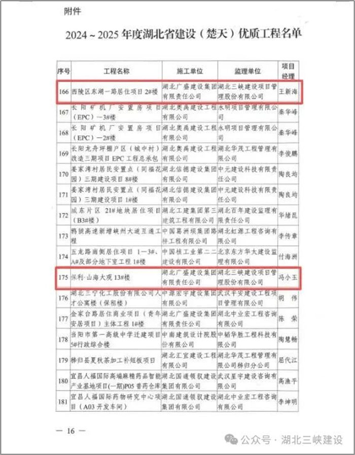 熱烈祝賀我公司在2024-2025年度湖北省建設(楚天)優質工程名單中,湖北三峽建設項目管理股份有限公司(含原宜昌平湖工程建設監理有限責任公司)等5個項目榮獲我省“楚天杯”!